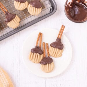 These Witches Broom Cookies are an easy and festive way to celebrate Halloween. A simple, six-ingredient brown sugar shortbread cookie paired with pretzels and chocolate makes a delicious treat.