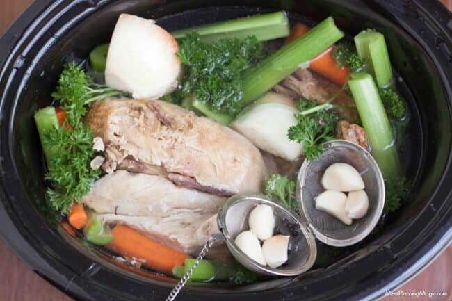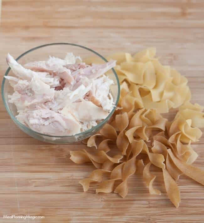 I start with a leftover Slowcooker Rotisserie Chicken that I had on hand. Of course, you can also use leftover rotisserie chicken that you have purchased. I like to buy the ones from my local wholesale club when I’m short on time or just not in the mood to make it myself. Did you also know you can freeze the rotisserie chicken carcass until you want to make soup? I do this all the time!