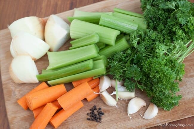 - Add carrots, celery, onion, garlic, parsley, peppercorns, salt and Worcestershire.