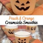 This Halloween Smoothie recipe features oranges, peaches, and a boost of protein from yogurt is a healthy, festive way to celebrate! Ready in just minutes, decorating the cups is fun for all ages, too!