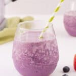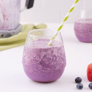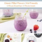 This PB&J Smoothie has all the flavors you love of the classic sandwich but in a smoothie! Made with peanut butter, strawberries, blueberries, and milk of your choice, and made in 5 minutes, it’s a perfect quick breakfast or snack any time.