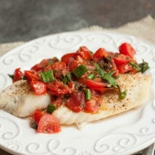 I first discovered this recipe for Simple Tomato Basil Topped Baked Fish many (many!) years ago when I was in college. It was a simple recipe that I could make easily in my apartment and I knew it was good for me too. It only takes a few minutes to chop up the tomatoes. You can sauté them and the rest of the ingredients while the fish is baking and you’ll have dinner to the table in under 30 minutes for sure!